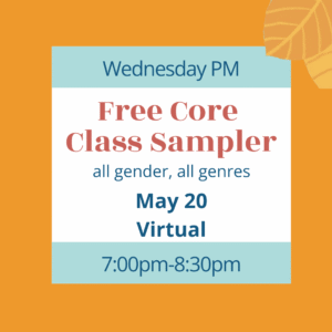 This is a sampler for the Wednesday PM Core Class AG that will begin June 10. The focus at Women Writing for (a) Change is honing your own unique voice through community practices that create a safe space to be brave. Samplers are a great way to check out a Women Writing for (a) Change class for free. A sampler can help you decide if a class is a good fit for you, from our practices, to the facilitator, and more.